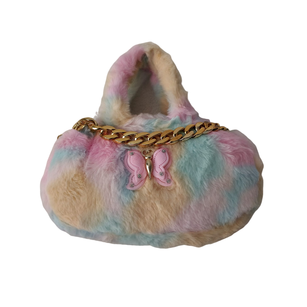 Add a touch of charm to your little one's style with this soft and fluffy multicolor fur handbag. Designed with pastel shades of pink, blue, and cream, it features a stylish golden chain and a cute butterfly embellishment in the center. Perfect for parties, outings, or casual wear, this lightweight bag is both fashionable and comfortable to carry. A lovely gift choice for kids